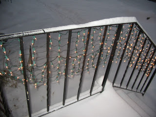Our lights out front on the railing. This is the first year we have put lights outside and they actually look very nice in the dark. :)